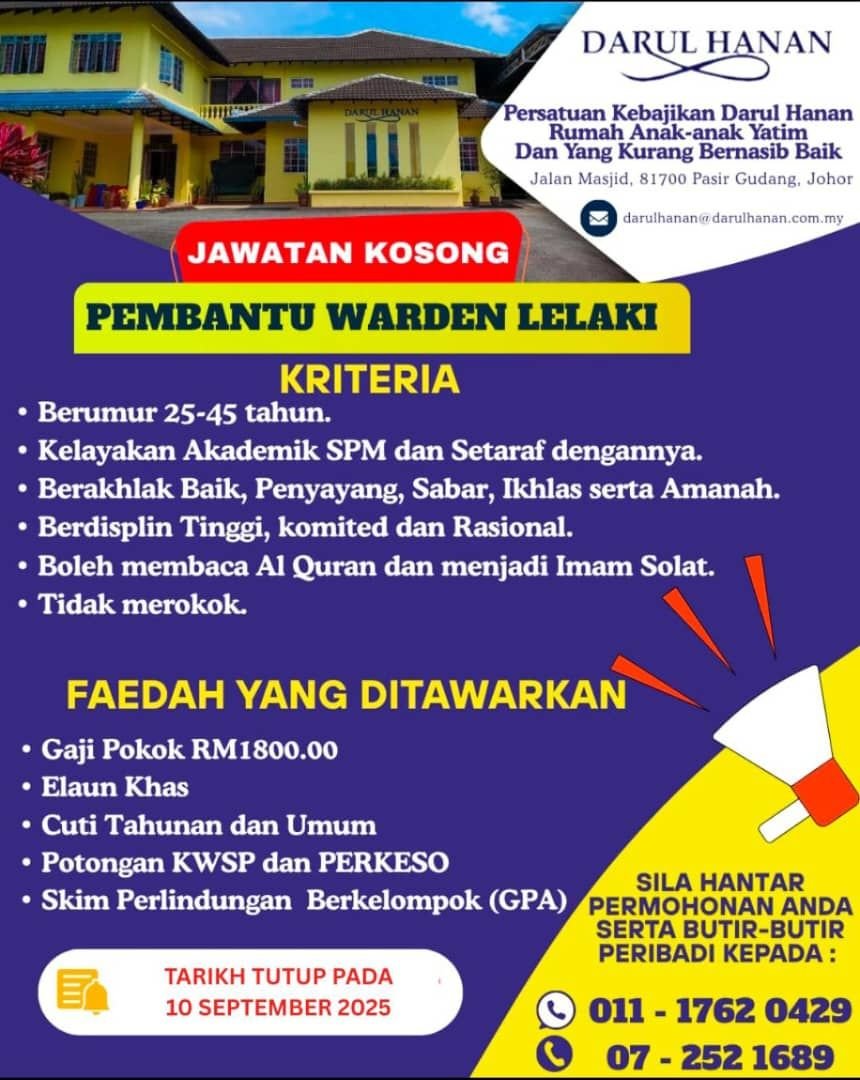 *JAWATAN KOSONG – PEMBANTU WARDEN LELAKI* Persatuan Kebajikan Darul Hanan, Pasir Gudang Kami mempelawa calon yang berkelayakan,[…]