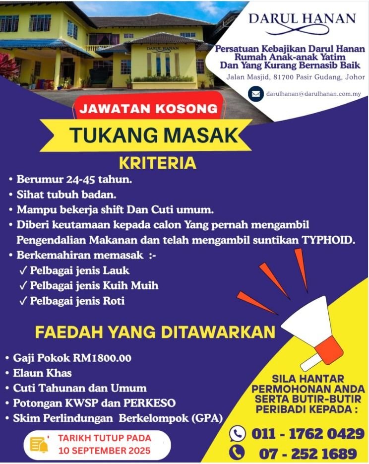 *JAWATAN KOSONG – TUKANG MASAK* Persatuan Kebajikan Darul Hanan, Pasir Gudang Kami sedang mencari individu yang berdedikasi[…]